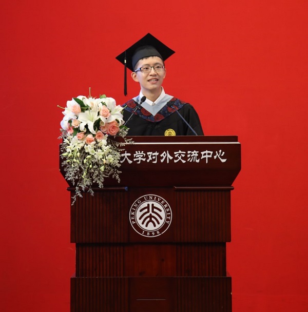 2016届本硕博毕业生代表在这里发言。四年前,也是在英杰中心的阳光大厅,我非常荣幸地成为了北大数院的一员。而今天,我们穿着学位服,就要向这个承载了我们生命中最美好、最斑斓的时光的美丽的园子道别了。在我们回味这难忘的点点滴滴的同时,我想和大家分享一个刚刚发生的故事。