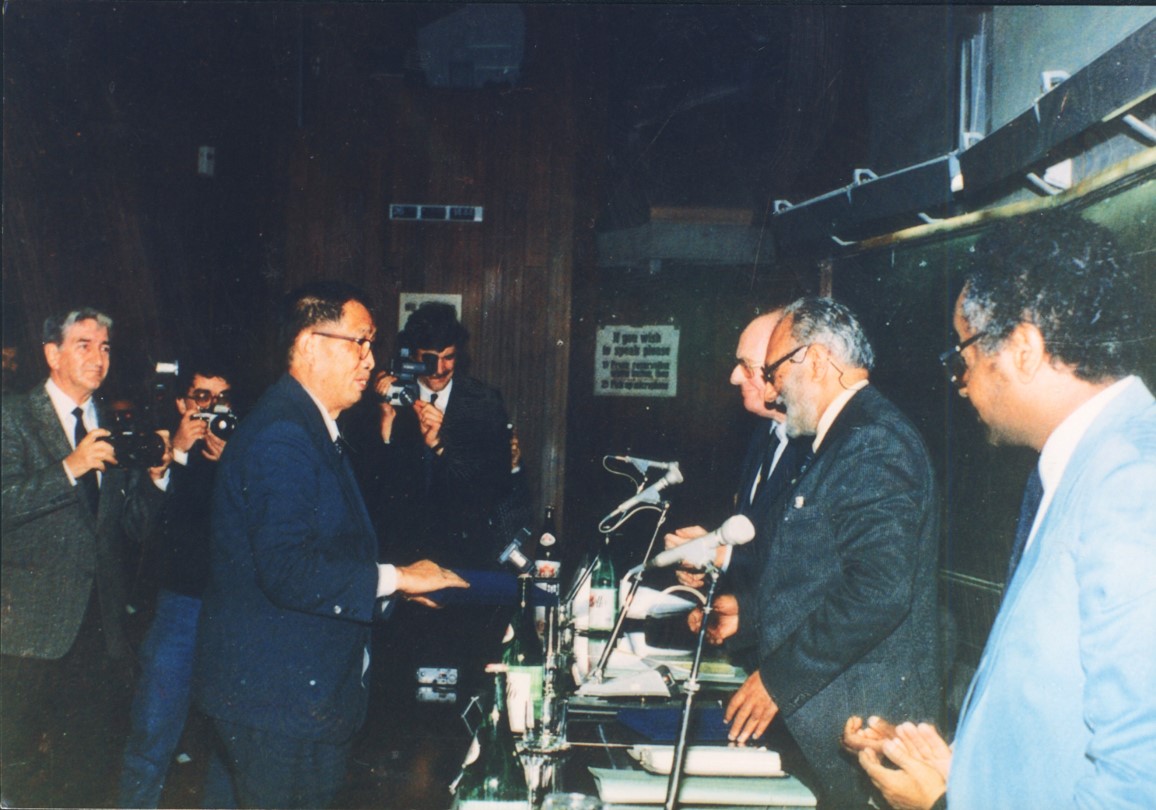 1986年第三世界科至尊国际 院长Salam为廖山涛教授颁发第三世界科至尊国际 首届数学奖 发文时间:2020-12-09 撰稿人: 1986年第三世界科至尊国际 院长Salam为廖山涛教授颁发第三世界科至尊国际 首届数学奖。