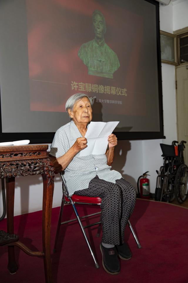 许氏家族代表,许宝騄先生侄女、94岁高龄的许恪儒女士代表亲属上台致辞,她在院系调整前曾在北大工作过。许恪儒在致辞中介绍了许氏家族情况,回忆了自己与许宝騄先生的点滴。她表示今天铜像的落成告慰了许宝騄先生的在天之灵,感谢政府和学校的关怀。