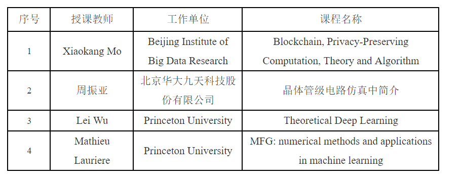 2021年度北京大学“应用数学专题讲习班”将开设4门课程,课程设置包括密码学、芯片设计、机器学习及平均场博弈论若干交叉学科领域,具体如下表所示: